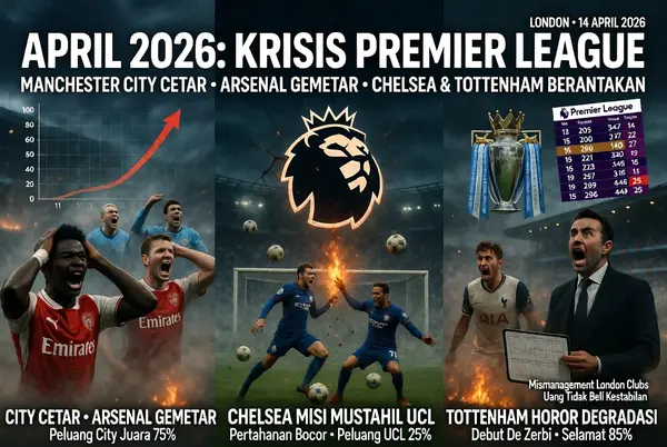 LONDON (14 April 2026) – Bulan April di Premier League tidak pernah berbohong. Ini adalah bulan di mana otot-otot yang kelelahan mulai robek, taktik manajer mulai terbaca, dan mentalitas juara diuji dalam suhu pembakaran tertinggi. Musim 2025/2026 menyajikan salah satu narasi paling gila dalam sejarah modern sepak bola Inggris. Di puncak klasemen, Arsenal sedang mengalami demam panggung yang kronis karena bayang-bayang mesin penghancur Manchester City yang semakin membesar di spion mereka.